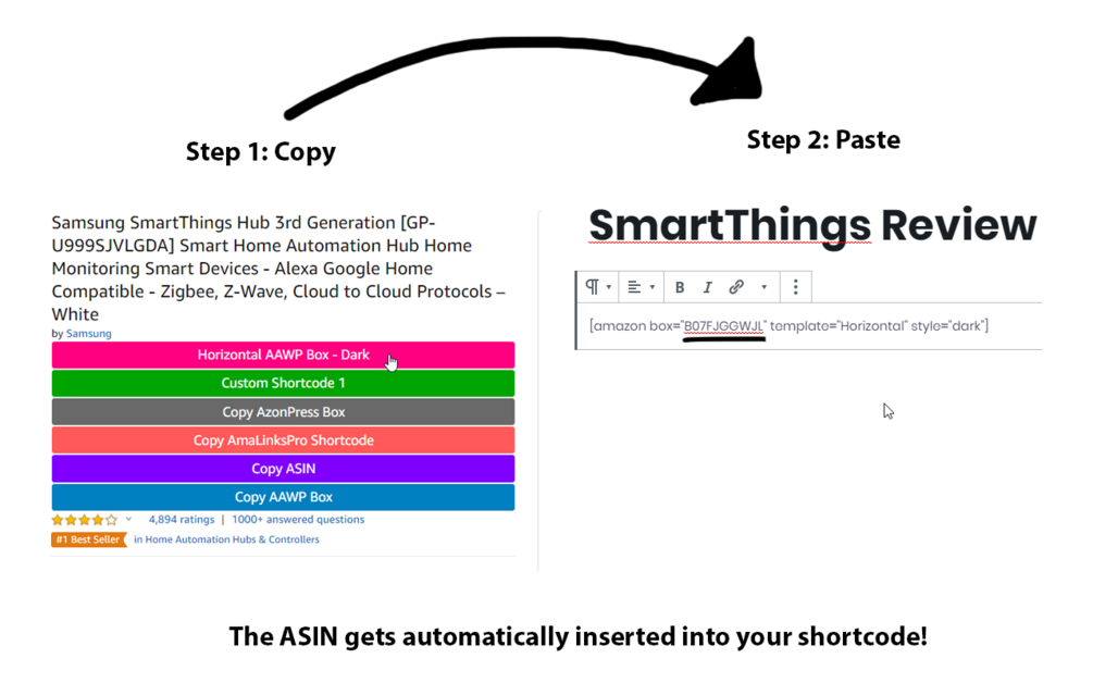 - "CopyShortcode" buttons automatically add ASIN directly into shortcode.